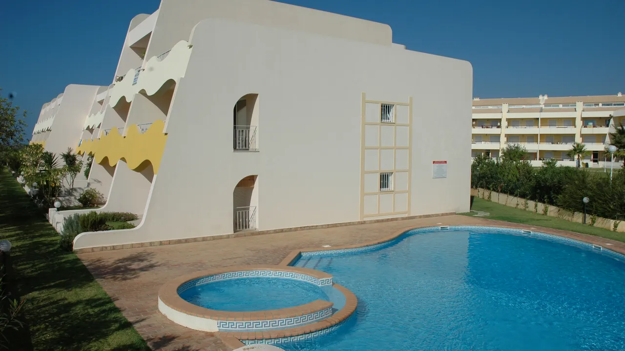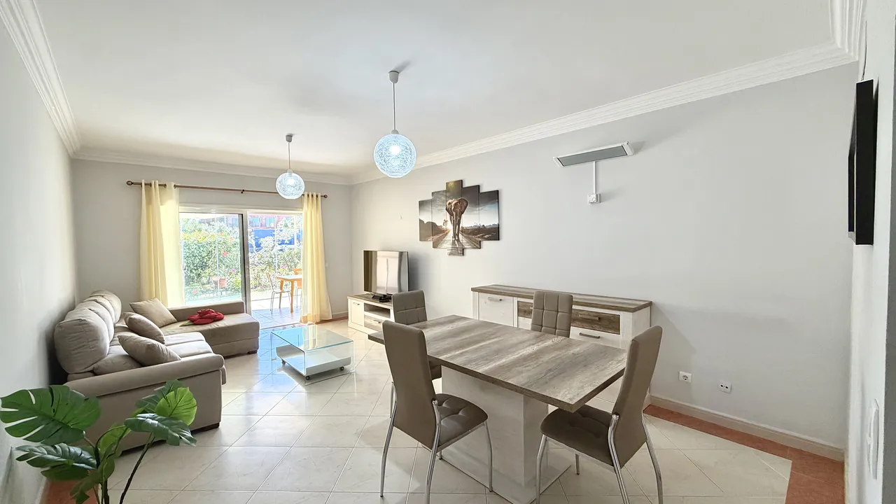 Apartamento T2 situado no 1º andar e inserido em condomínio com agradáveis zonas verdes, a apenas a alguns metros do golfe e a 3km da praia.